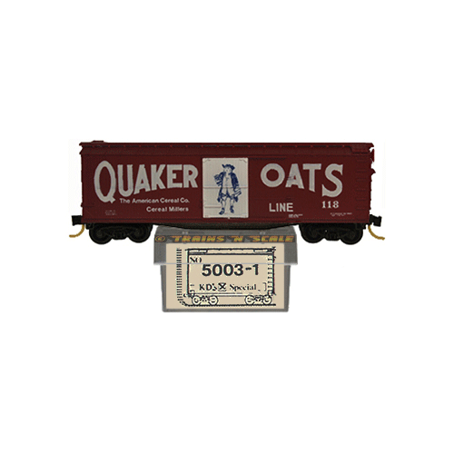 Quaker Oats Line (with "Quaker" figure logos printed on the doors and "The American Cereal Co. Cereal Millers" text) 40 Foot Double Sheathed Wood Sliding Door Boxcar with a horizontal brake wheel, white doors, dark red paint, and navy blue and white printing. In C-9 condition with truck mounted Magne-Matic knuckle couplers, operating doors, and smooth backed wheels, this Kadee Micro-Trains model was decorated by the now defunct Aksarben Hobby Company. |
